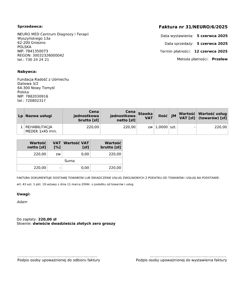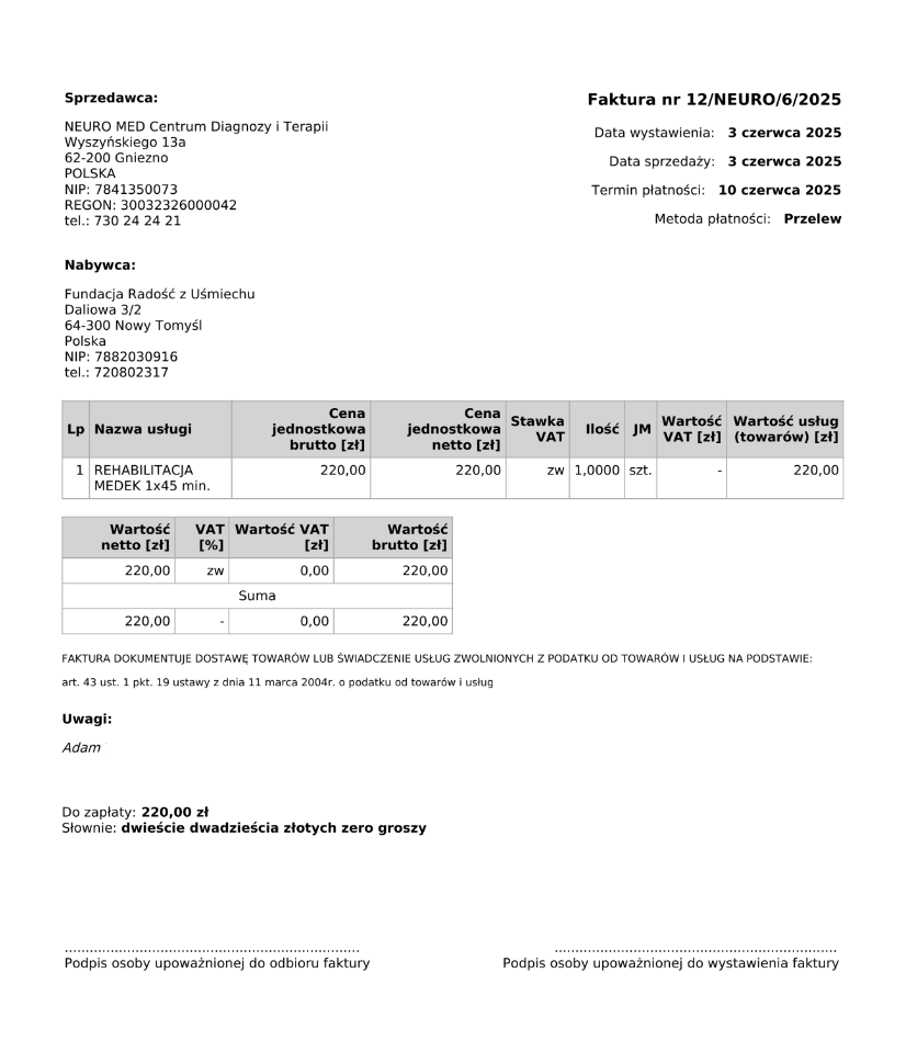 „Zajęcia odbywają się regularnie i przynoszą bardzo pozytywne efekty. Adaś coraz pewniej utrzymuje głowę, wykazuje większą stabilizację tułowia oraz coraz lepsze podparcie na kończynach górnych. Terapia CME Medek doskonale stymuluje jego rozwój motoryczny i wspiera go w codziennym funkcjonowaniu.”
